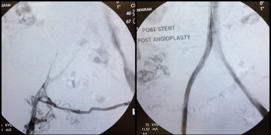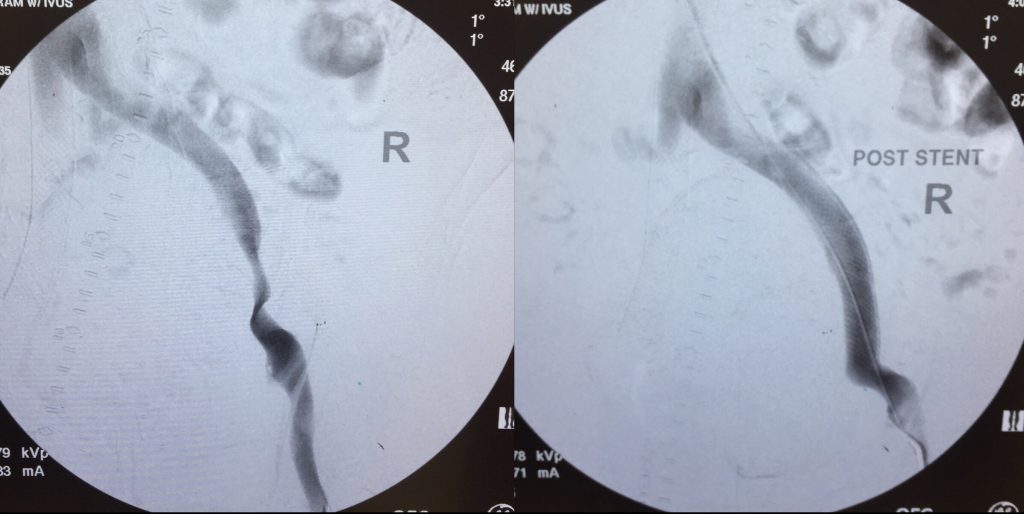 Dr. Shirey was able to endovascularly reconstruct the iliac veins and IVC with angioplasty and stent placement.