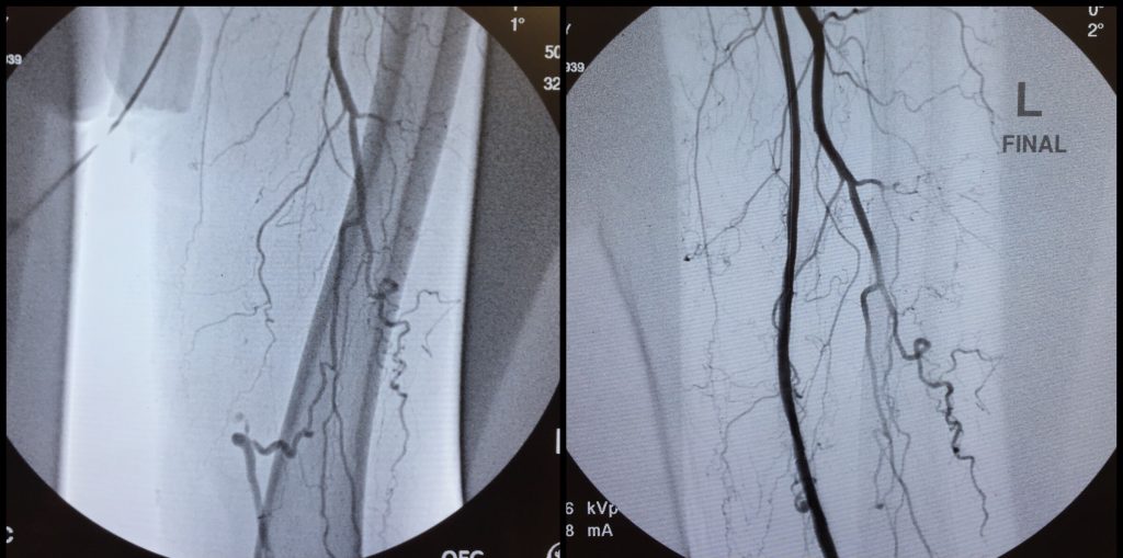 Compare that with the patient’s left leg which was worked on by another doctor at a local hospital. The left leg has multiple long stents in the patient’s left thigh artery that have clogged after a short time. This is why it’s better to not place such long stents in the leg arteries if possible.