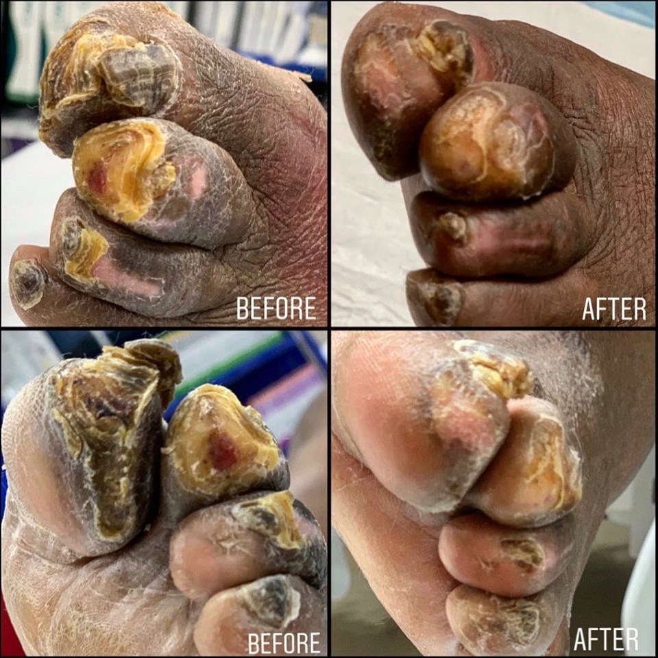 These photos show results after a three week follow up. This patient had non-healing ulcers on his toes due to severe blockages in the small arteries below the knee. This patient was facing multiple toe amputations which were avoided after Dr. Shirey opened the artery blockages below the knee. The patient’s toes continued to heal and the patient was able to return to work.